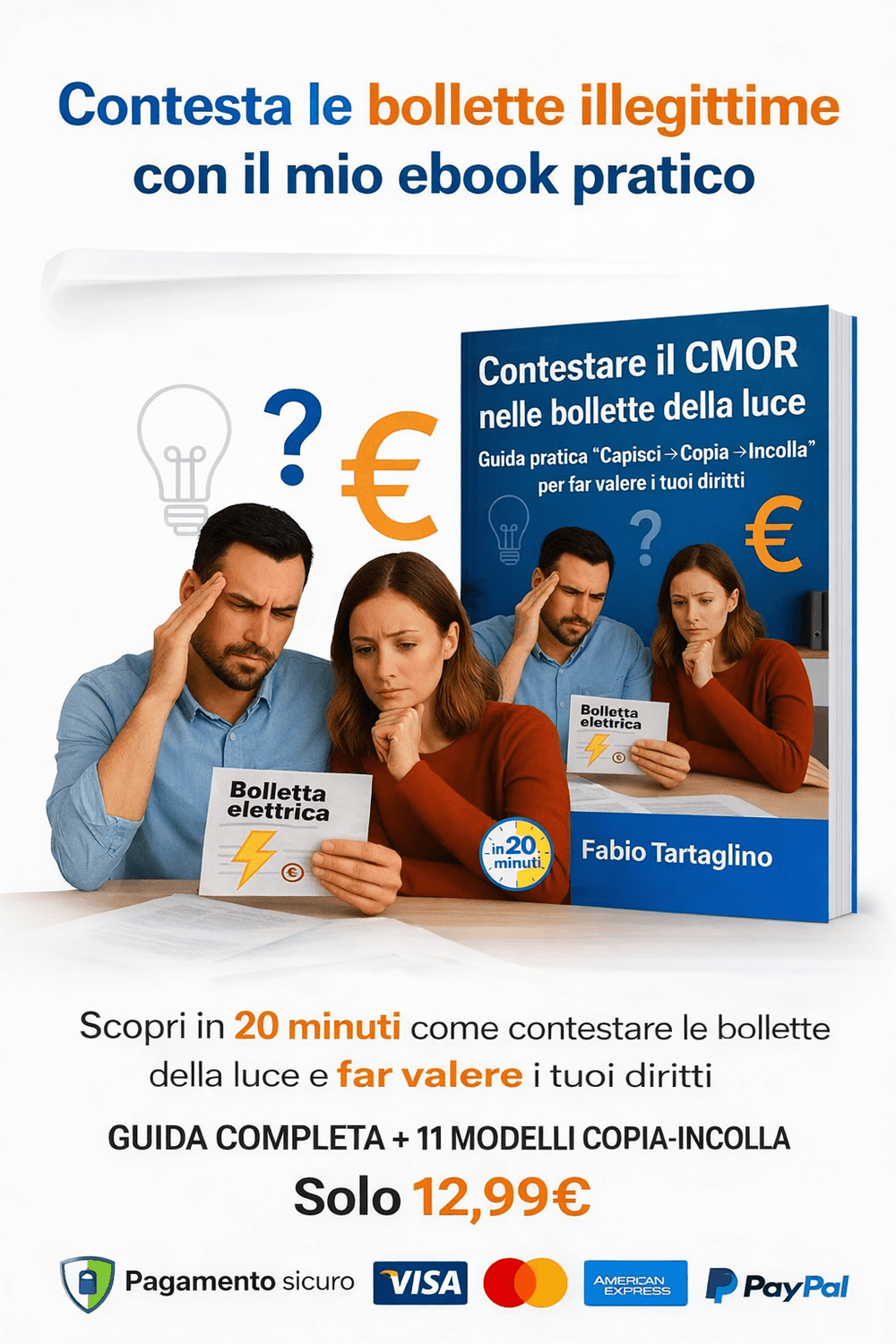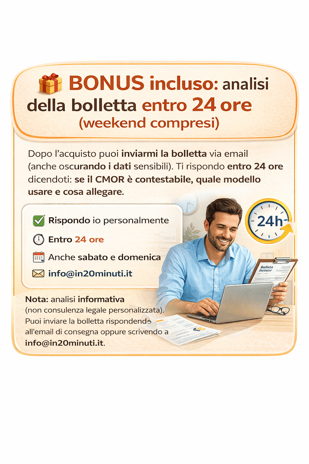 È proprio qui che ti aiuto: dopo l’acquisto puoi inviarmi la bolletta (anche oscurando i dati sensibili) a info@in20minuti.it oppure rispondere direttamente all’email di consegna. Entro 24 ore (weekend compresi) ti dico quale modello usare e cosa allegare.